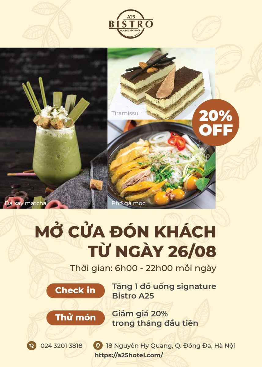 Với quyết tâm chinh phục sự hài lòng cao nhất của quý khách hàng, xây dựng thương hiệu ẩm thực mang phong cách ấm áp và và nhiều cảm xúc, A25 Hotel ra mắt thưởng hiệu A25 Bistro Food & Beverage, chính thức khai trương ngày 26/08.