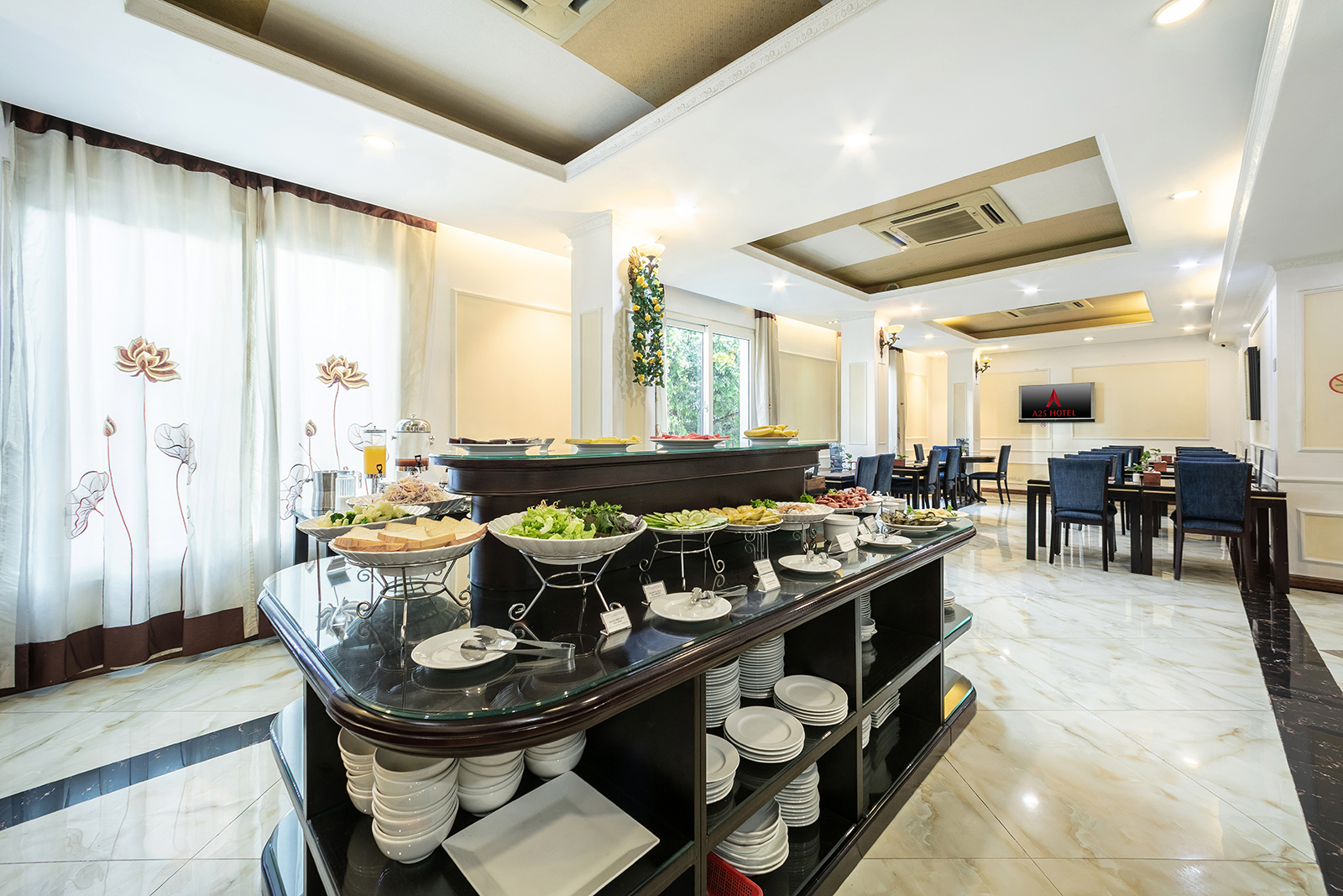 Nhà hàng và khu bếp tiện nghi, luôn sẵn sàng phục vụ và mang đến cho quý khách những món ăn trọn vị. Buffet sáng đa dạng, phong phú về món ăn được chuẩn bị miễn phí dành cho những khách hàng lưu trú qua đêm tại A25 Luxury Hotel - 15 Trần Quốc Toản.