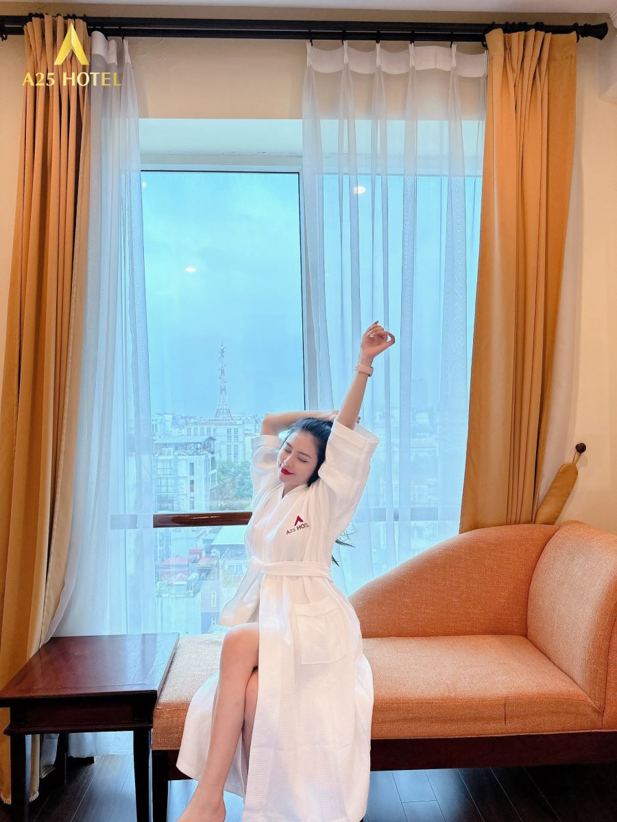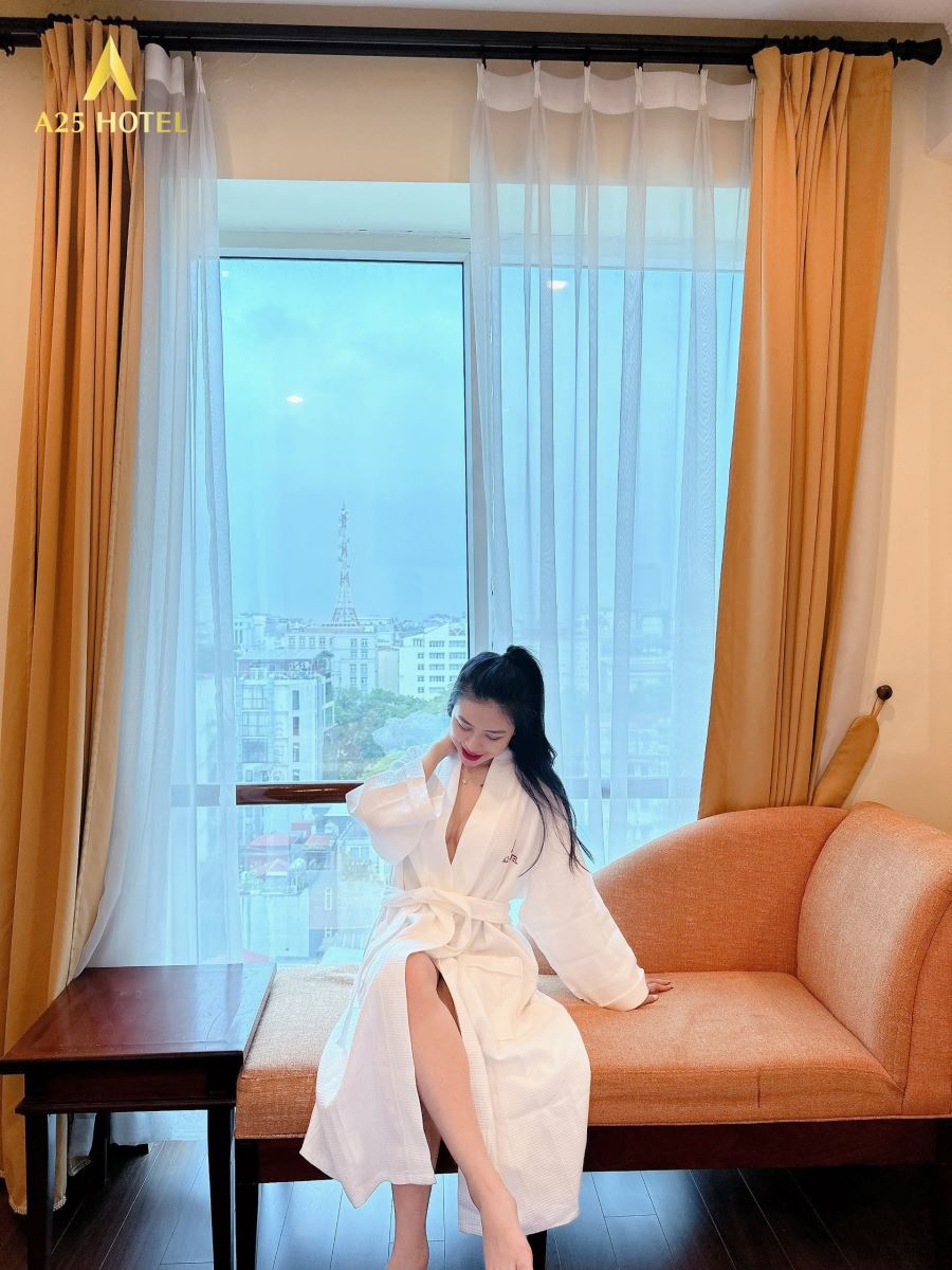 Tiêu chi lựa chọn phòng nghỉ của Tú Anh là phải thoáng đãng, view thật đẹp bởi cô nàng có sở thích chụp ảnh, những bức ảnh của cô truyền cảm hứng đến rất nhiều tín đồ du lịch và làm đẹp. Chiều lòng vị khách hàng đáng yêu, A25 Hotel đã dành hạng phòng Suite Vip với ô cửa sổ ôm trọn view bầu trời tại cơ sở 15 Trần Quốc Toản.