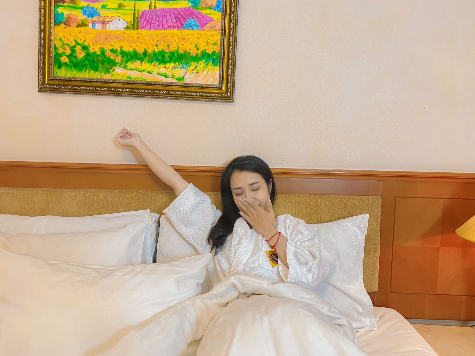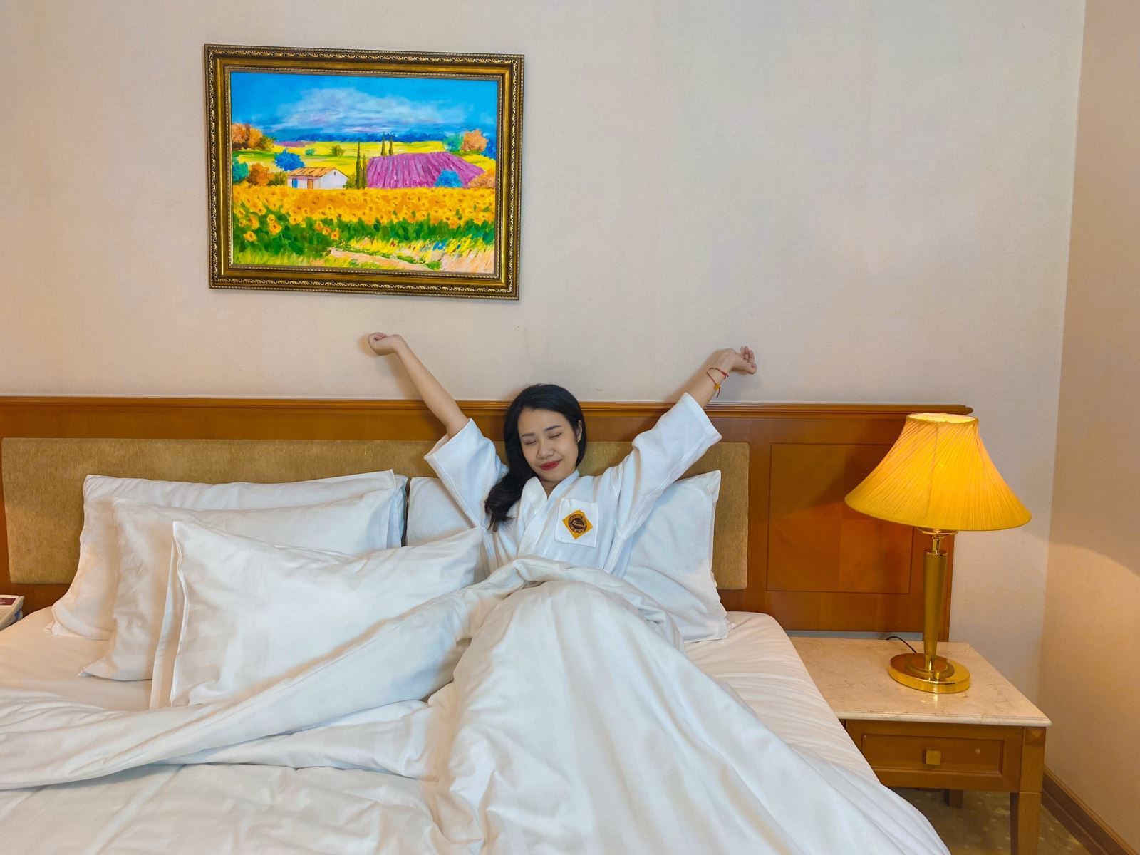 Phòng nghỉ của A25 Luxury Hotel 684 Minh Khai là một tác phẩm nghệ thuật. Thiết kế đẹp mắt, hiện đại và sang trọng đã tạo nên một không gian nghỉ ngơi lý tưởng. Mọi thứ đều được sắp xếp một cách tỉ mỉ và tiện nghi đáp ứng tất cả những nhu cầu của một giám đốc tài chính cấp cao. Giường êm ái và chăn mền mềm mại đã đảm bảo cho Vân Anh có một giấc ngủ tuyệt vời. Phòng tắm rộng rãi với các sản phẩm chăm sóc cá nhân cao cấp tạo ra một không gian thư giãn đáng nhớ. Vân Anh rạng rỡ và tươi tắn trong những bức hình chụp tại căn phòng đón nắng đẹp và thư giãn khi nhìn ra khung cửa bên ngoài với toàn cảnh thành phố khu vực cầu Vĩnh Tuy.