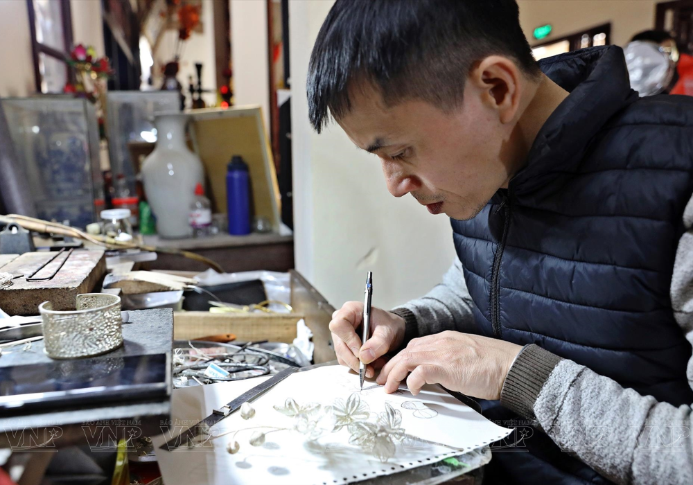 Thợ bạc tỉ mỉ thiết kế hình dáng trang sức đấu bạc (Ảnh: Báo Ảnh Việt Nam)