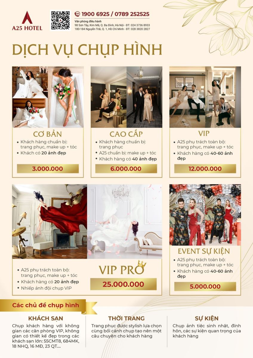 Dịch vụ chụp hình với ekip của A25 Hotel chúng tôi không chỉ mang tính chất chuyên nghiệp, mà còn mang đến sự thoải mái và thân thiện. Chúng tôi sẽ tạo ra một môi trường dễ chịu và tự nhiên để khách hàng cảm thấy thoải mái và tự nhiên khi chụp hình. Đội ngũ nhiếp ảnh gia của chúng tôi sẽ tận dụng ánh sáng tự nhiên và không gian trong khách sạn để tạo ra những bức ảnh sống động và chân thực.