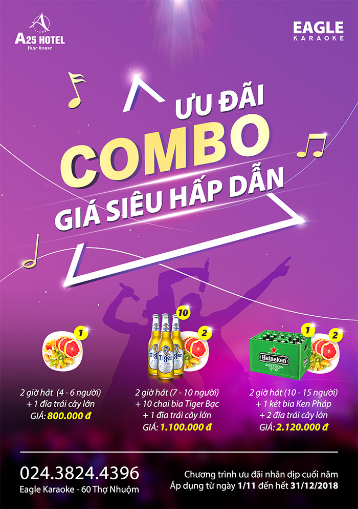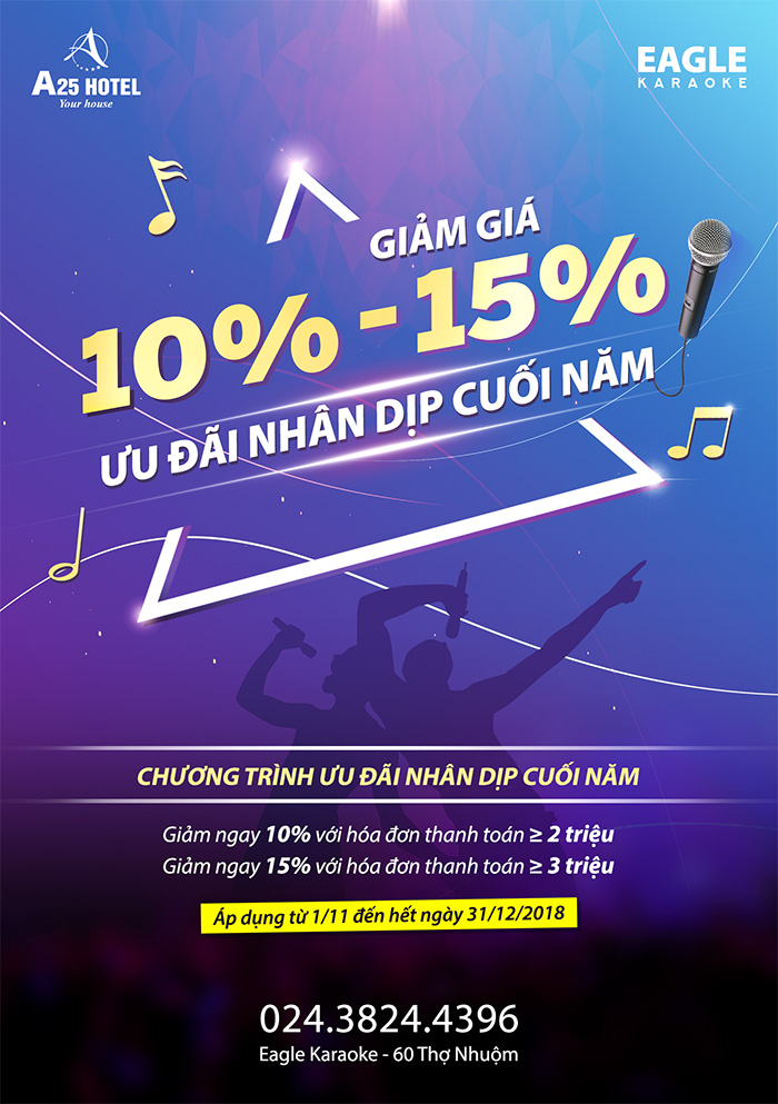 Tập đoàn Khách sạn A25 xin giới thiệu chương trình ưu đãi nhân dịp cuối năm. Ưu đãi áp dụng với khách hàng sử dụng dịch vụ tại Eagle Karaoke, địa chỉ 60 Thợ Nhuộm.