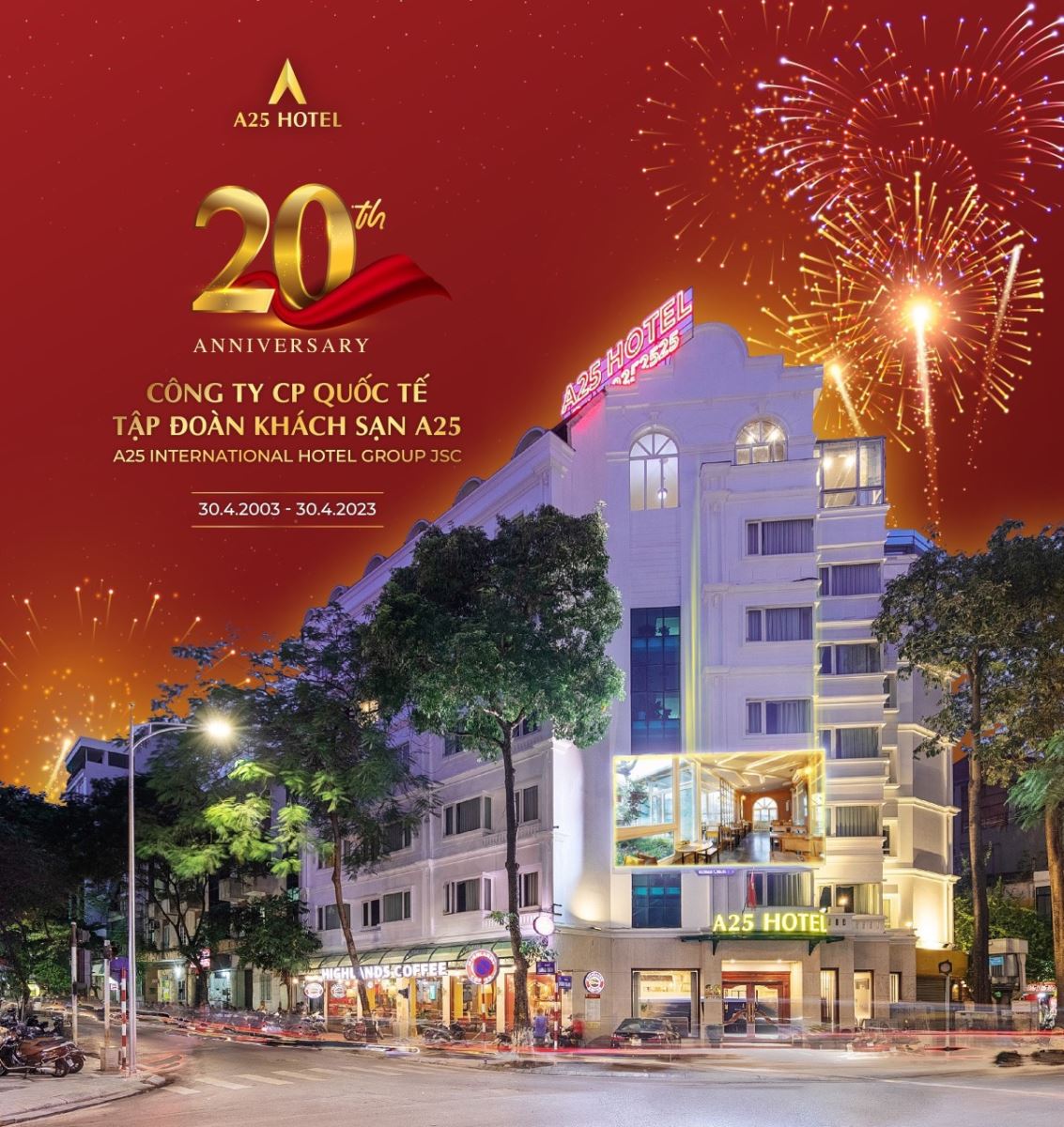 Tính tới 2024, Tập đoàn Khách sạn A25 quen thuộc với người dân Việt Nam đã được lập ra hơn 2 thập kỷ - chính thức đạt 21 năm vào đúng 30/04 này. Tập đoàn dành tặng Quý Khách hàng ưu đãi giảm đáng kể cho phòng lưu trú tại các thành phố du lịch.