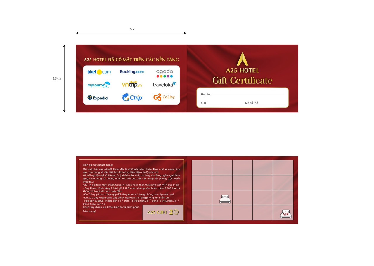 Với mỗi giao dịch đặt phòng trên các trang OTA thành công, khi đến với mỗi khách sạn, Quý khách sẽ được nhận ngay một tấm thẻ quà tặng nhét vừa vào ví với những ưu đãi hấp dẫn cùng thông điệp yêu thương của A25 Hotel: