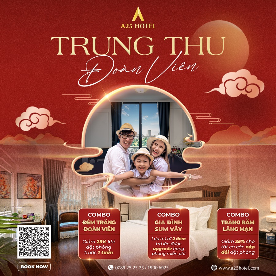- Combo "Trăng rằm lãng mạn": Giảm ngay 25% cho tất cả các cặp đôi lưu trú tại A25 Hotel.