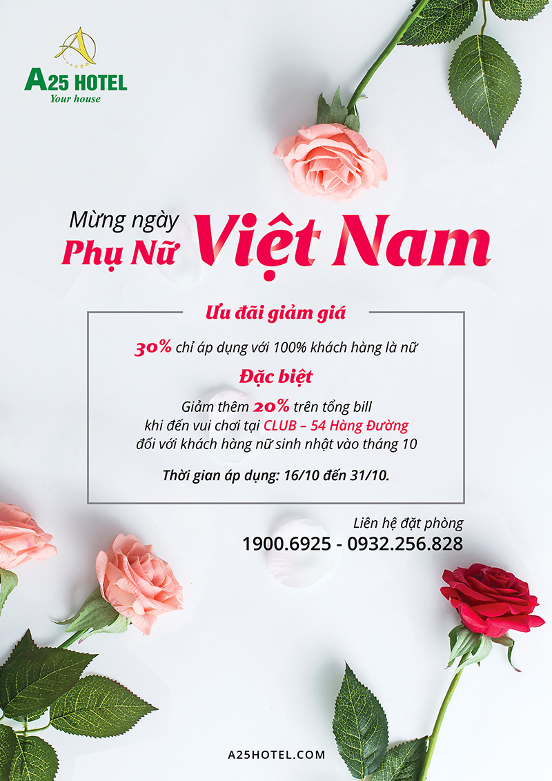 Chào mừng ngày Phụ nữ Việt Nam 20/10, Khách sạn A25 triển khai chương trình “Ưu đãi 20/10 dành cho các chị em phụ nữ với mức giảm giá hấp dẫn lên đến 30% tại tất cả các chi nhánh thuộc chuỗi khách sạn A25.